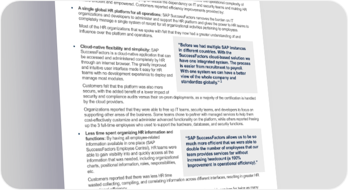 Economic Validation: Analyzing the Economic Benefits of Moving from SAP ERP HCM to SAP SuccessFactors Solutions services and provide them with the information that they required. In addition, HR received more positive and constructive feedback. More Efficient HR and IT Operations SAP SuccessFactors provides a cloud-based unified platform that helps to reduce the operational complexity of providing employee-related services, helping to reduce the dependency on IT and security teams and making HR teams more efficient and empowered. Customers reported efficiency improvements provided by: • A single global HR platform for all operations: SAP SuccessFactors removes the burden on IT organizations and developers to administer and support the HR platform and gives the power to HR teams to completely manage a single system of record for all organizational activities pertaining to employees. Most of the HR organizations that we spoke with felt that they now had a greater understanding of and influence over the platform and operations. “Before we had multiple SAP instances • Cloud-native flexibility and simplicity: SAP in different countries. With the SuccessFactors is a cloud-native application that can SuccessFactors cloud-based solution we be accessed and administered completely by HR have one integrated system. The process through an internet browser. The greatly improved is easier from recruitment to payroll. and intuitive user interface made it easy for HR With one system we can have a better teams with no development experience to deploy and view of the whole company and manage most modules. 2 standardize globally.” Customers felt that the platform was also more secure, with the added benefit of a lower impact of security and compliance audits versus their on-prem deployments, as a majority of the certification is handled by the cloud providers. Organizations reported that they were able to free up IT teams, security teams, and developers to focus on supporting other areas of the business. Some teams chose to partner with managed services to help them cost-effectively customize and administer advanced functionality on the platform, while others reported freeing up the 3 full-time employees who used to support the hardware, databases, and security functions. • Less time spent organizing HR information and functions: By having all employee-related “SAP SuccessFactors allows us to be so information available in one place (SAP much more efficient that we were able to SuccessFactors Employee Central), HR teams were double the number of employees that our able to gain visibility into and quickly access all the team provides services for without information that was needed, including organizational increasing headcount (a 100% charts, positional information, roles, responsibilities, Improvement in operational efficiency).” etc. Customers reported that there was less HR time wasted collecting, compiling, and correlating information across different interfaces, resulting in greater HR operational efficiency. On average, teams reported that SAP SuccessFactors allows them to provide services for twice as many employees without having to increase the HR team headcount—a 100% improvement in operational efficiency. • Streamlined HR workflows: Moving to SAP SuccessFactors provided the opportunity for HR teams to redesign their processes away from being reliant on reactive manual operations and data entry toward providing proactive self-service operations, efficient reuse of entered data, and automated and streamlined workflows. 2 Source: SAP SuccessFactors Customer, Financial Services Company (source: TrustRadius) 7