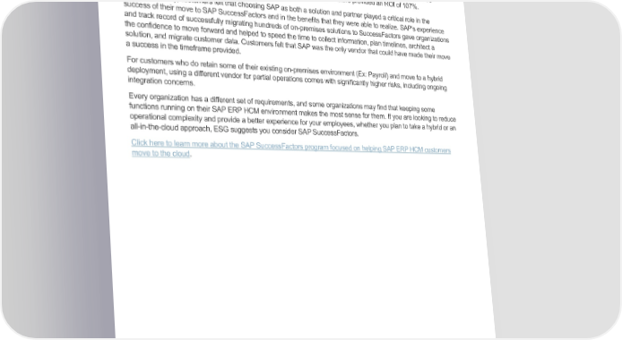 Economic Validation: Analyzing the Economic Benefits of Moving from SAP ERP HCM to SAP SuccessFactors Solutions operational complexity for HR teams by 50% or more, and better enable the business to innovate and make more informed decisions. Our five-year modeled scenario predicted that SAP SuccessFactors could save organizations millions of dollars in avoided costs of on-premises solutions, systems and application administration, localization costs, and HR operations, while providing the tangible benefits of improved employee productivity and positive impact to revenue. Our models predicted that moving to SAP SuccessFactors provided an ROI of 107%. More importantly, customers felt that choosing SAP as both a solution and partner played a critical role in the success of their move to SAP SuccessFactors and in the benefits that they were able to realize. SAP’s experience and track record of successfully migrating hundreds of on-premises solutions to SuccessFactors gave organizations the confidence to move forward and helped to speed the time to collect information, plan timelines, architect a solution, and migrate customer data. Customers felt that SAP was the only vendor that could have made their move a success in the timeframe provided. For customers who do retain some of their existing on-premises environment (Ex: Payroll) and move to a hybrid deployment, using a different vendor for partial operations comes with significantly higher risks, including ongoing integration concerns. Every organization has a different set of requirements, and some organizations may find that keeping some functions running on their SAP ERP HCM environment makes the most sense for them. If you are looking to reduce operational complexity and provide a better experience for your employees, whether you plan to take a hybrid or an all-in-the-cloud approach, ESG suggests you consider SAP SuccessFactors. Click here to learn more about the SAP SuccessFactors program focused on helping SAP ERP HCM customers move to the cloud. 14