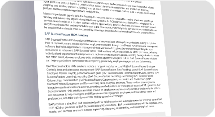 Economic Validation: Analyzing the Economic Benefits of Moving from SAP ERP HCM to SAP SuccessFactors Solutions The needs and expectations of the workforce are changing as workers have become accustomed to intelligent technologies that allow them to quickly and easily access the information needed and perform the tasks that are required of them. Expectations are changing, and workers demand that their employer delivers them a modern and tailored experience to empower them to understand and negotiate the tasks required of them, learn and grow, and receive fair and transparent pay and recognition based on their performance rather than their position. Organizations need to become more agile across all functions of the business and move toward simple but efficient digital platforms that put them in a better position to execute on business priorities and enable their incoming, outgoing, and existing workforce. Shifting from an admin-centric on-premises platform to an employee-centric cloud platform enables modern organizations to do just this. Many companies struggle to take the first step to overcome common hurdles like creating a business case to get funding and overcoming organizational readiness concerns. An ROI analysis should consider moving to pay for a service-based model on a modern platform with the opportunity to transform business processes and clean up and carry forward essential and relevant data over to the new system. Potential pitfalls can be avoided, and projects can be accelerated and made more successful by choosing a trusted and experienced partner and a proven platform. SAP SuccessFactors HXM Solutions SAP SuccessFactors HXM solutions offer a comprehensive suite of offerings for organizations looking to optimize their HR operations and create a positive employee experience through cloud-based human resource management software that helps organizations manage their total workforce throughout the entire employee lifecycle, from recruitment to retirement. SAP SuccessFactors HXM solutions include capabilities for all HR processes, delivering individualized experiences that empower and motivate an organization’s people, enabling the organization to attract and retain talent, develop employee skills, and foster a positive workplace culture. SAP SuccessFactors solutions can help organizations lower costs while improving productivity, employee engagement, and data security. SAP SuccessFactors HXM solutions include a range of modules for core HR (SAP SuccessFactors Employee Central), time and attendance management (SAP SuccessFactors Time Tracking), payroll (SAP SuccessFactors Employee Central Payroll), performance and goals (SAP SuccessFactors Performance and Goals), learning (SAP SuccessFactors Learning), recruiting (SAP SuccessFactors Recruiting), onboarding (SAP SuccessFactors Onboarding), compensation (SAP SuccessFactors Compensation), succession and development (SAP SuccessFactors Succession and Development), skills, analytics, and more. These modules are designed to integrate seamlessly with one another, providing a unified platform for managing all aspects of HR operations. SAP SuccessFactors HXM solutions maintais a focus on employee experience and provides a single portal for all tools and resources to help managers and HR professionals engage with employees, understand their needs and preferences, and tailor their development and career paths accordingly. SAP provides a simplified and accelerated path for existing customers looking to modernize from their current SAP ERP HCM on premises to SAP SuccessFactors HXM solutions. SAP provides customers with the expertise, tools, assets, and services to ensure success in planning, designing, implementing, and supporting their move. SAP provides their existing customers with features and results that would be extremely difficult for any other provider to deliver, while greatly reducing the risk of running into potential roadblocks and functional tradeoffs. 4