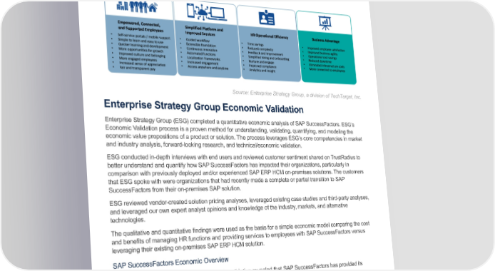 Economic Validation: Analyzing the Economic Benefits of Moving from SAP ERP HCM to SAP SuccessFactors Solutions Figure 2. SAP SuccessFactors Solutions Source: Enterprise Strategy Group, a division of TechTarget, Inc. Enterprise Strategy Group Economic Validation Enterprise Strategy Group (ESG) completed a quantitative economic analysis of SAP SuccessFactors. ESG’s Economic Validation process is a proven method for understanding, validating, quantifying, and modeling the economic value propositions of a product or solution. The process leverages ESG’s core competencies in market and industry analysis, forward-looking research, and technical/economic validation. ESG conducted in-depth interviews with end users and reviewed customer sentiment shared on TrustRadius to better understand and quantify how SAP SuccessFactors has impacted their organizations, particularly in comparison with previously deployed and/or experienced SAP ERP HCM on-premises solutions. The customers that ESG spoke with were organizations that had recently made a complete or partial transition to SAP SuccessFactors from their on-premises SAP solution. ESG reviewed vendor-created solution pricing analyses, leveraged existing case studies and third-party analyses, and leveraged our own expert analyst opinions and knowledge of the industry, markets, and alternative technologies. The qualitative and quantitative findings were used as the basis for a simple economic model comparing the cost and benefits of managing HR functions and providing services to employees with SAP SuccessFactors versus leveraging their existing on-premises SAP ERP HCM solution. SAP SuccessFactors Economic Overview Enterprise Strategy Group’s (ESG) economic validation revealed that SAP SuccessFactors has provided its customers with significant savings and benefits in the following categories: • Improved Experience for all Employees – SAP SuccessFactors improved the end-user experience for all employees of the organization, including end users, HR professionals, IT teams, and business decision- makers. • More Efficient HR and IT Operations – SAP SuccessFactors provided a single, unified platform that reduced complexity and provided automation, allowing HR resources to manage the entire platform with less effort and freeing resources to achieve more. 5