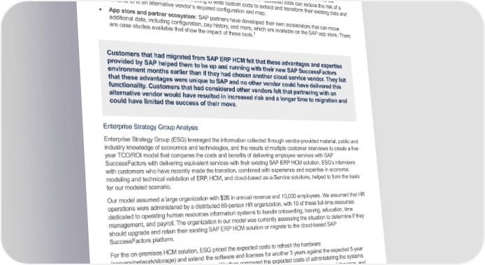Economic Validation: Analyzing the Economic Benefits of Moving from SAP ERP HCM to SAP SuccessFactors Solutions SuccessFactors deployment by identifying and adding what may be useful to the organization and eliminating what is no longer needed. • Efficient migration of existing HR installation: SAP customers can leverage more of their existing HCM installation with delivered tools to migrate their existing employee data that are pre-mapped from the old system to the new one, which can save significant time. These SAP-delivered tools can reduce the risk of a project for customers. Rather than having to write custom code to extract and transform their existing data and schema to fit an alternative vendor’s required configuration and map. • App store and partner ecosystem: SAP partners have developed their own accelerators that can move additional data, including configuration, pay history, and more, which are available on the SAP app store. There 3 are case studies available that show the impact of these tools. Customers that had migrated from SAP ERP HCM felt that these advantages and expertise provided by SAP helped them to be up and running with their new SAP SuccessFactors environment months earlier than if they had chosen another cloud service vendor. They felt that these advantages were unique to SAP and no other vendor could have delivered this functionality. Customers that had considered other vendors felt that partnering with an alternative vendor would have resulted in increased risk and a longer time to migration and could have limited the success of their move. Enterprise Strategy Group Analysis Enterprise Strategy Group (ESG) leveraged the information collected through vendor-provided material, public and industry knowledge of economics and technologies, and the results of multiple customer interviews to create a five- year TCO/ROI model that compares the costs and benefits of delivering employee services with SAP SuccessFactors with delivering equivalent services with their existing SAP ERP HCM solution. ESG’s interviews with customers who have recently made the transition, combined with experience and expertise in economic modeling and technical validation of ERP, HCM, and cloud-based as-a-Service solutions, helped to form the basis for our modeled scenario. Our model assumed a large organization with $2B in annual revenue and 10,000 employees. We assumed that HR operations were administered by a distributed 60-person HR organization, with 10 of these full-time resources dedicated to operating human resources information systems to handle onboarding, training, education, time management, and payroll. The organization in our model was currently assessing the situation to determine if they should upgrade and retain their existing SAP ERP HCM solution or migrate to the cloud-based SAP SuccessFactors platform. For the on-premises HCM solution, ESG priced the expected costs to refresh the hardware (servers/network/storage) and extend the software and licenses for another 5 years against the expected 5-year subscription costs of SAP SuccessFactors. We then compared the expected costs of administering the systems and databases. This included the number of resources required to support systems upgrades, maintenance, and patches and administer security for various databases, operating systems, and hardware. We assumed that on- premises operations could be phased out after 1 year for SAP SuccessFactors to accommodate the migration. Next, we considered the expected cost of managing, maintaining, and supporting updates to the required SAP ERP HCM applications and modules to continuously deliver services. For the SAP SuccessFactors implementation, we assumed full cost for on-premises operations for the first year and then 50% reduced costs for the remaining years. 3 Source: TIK Case Study: Coles Group. 10
