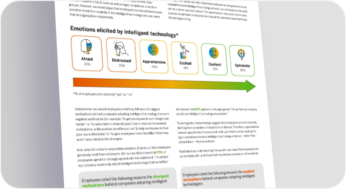 Part II: How do employees feel about intelligent technology at work? Our research revealed that decisions related to the adoption of intelligent Although the media has often depicted employees as being fearful of and technology do not sit solely with HR, but rather span across other resistant toward intelligent technology at work, our employee survey data decision-makers in the C-suite as well as legal, compliance, and other paints a more nuanced picture ⸀ The apprehension may exist, but so does groups ⸀ However, we would argue that employees too should have a voice a sense of optimism and excitement about the potential value that these (whether implicit or explicit) in the intelligent technology and use cases technologies bring ⸀ that an organization implements ⸀ Emotions elicited by intelligent technology* Afraid Distressed Apprehensive Excited Content Optimistic 25% 26% 44% 74% 75% 80% *% of employees who selected “yes” vs ⸀ “no” Indeed when we asked employees what they felt were the biggest employees” and 81% agreed or strongly agreed, “I trust that my company motivations behind companies adopting intelligent technology, the more would use intelligent technology responsibly ⸀” negative sentiments (for example, “to get employees to work longer and harder” or “to automate or eliminate jobs”) were rated as the weakest Taken together, these 昀椀ndings suggest that employees are not inherently motivations, while positive bene昀椀ts such as “to help employees do their starting from a baseline of skepticism or distrust ⸀ Therefore, organizations jobs more e昀昀ectively” or “to give employees more 昀氀exibility in how they have an opportunity to secure and build upon that trust by creating the work” were rated as the strongest ⸀ right conditions whereby intelligent technology enhance – rather than detract from – their experience ⸀ And, when it comes to responsible adoption, it turns out that employees genuinely trust their employers. Our survey data shows that 75% of Trust starts by understanding the speci昀椀c use cases that employees are employees agreed or strongly agreed with the statement, “I trust that comfortable with, and those that they feel are invasive or not bene昀椀cial. my company would only adopt intelligent technology that bene昀椀tted Employees rated the following reasons the strongest Employees rated the following reasons the weakest motivations behind companies adopting intelligent motivations behind companies adopting intelligent technologies: technologies: 1. To improve company’s overall e昀케ciency 1 ⸀ To provide employees with a more personalized experience 2. To help employees do their jobs more e昀昀ectively 2 ⸀ To automate or eliminate employees’ jobs 3. To give employees more 昀氀exibility in how they worked 3 ⸀ To get employees to work longer and harder Figure 4: Employees are generally positive about intelligent technologies at work ⸀