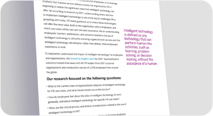 Introduction In HR, use cases of intelligent technology – for example, arti昀椀cial intelligence (AI) and machine learning (ML) – are becoming increasingly common ⸀ Whether it’s used to identify the right talent for employers, to provide targeted skills and learning recommendations for employees, or to leverage chatbots that improve service delivery across the organization, HR is beginning to realize the signi昀椀cant value that intelligent technology can o昀昀er. Yet according to research by IDC1, understanding where and how to implement intelligent technology is one of the top 10 challenges HR is grappling with today ⸀ HR needs guidance as to where these technologies will o昀昀er the most value, both to the organization and to employees, and Intelligent technology which use cases will be met with the least resistance ⸀ Better understanding employees’ comfort, preferences, and concerns related to the use of is de昀椀ned as any intelligent technology is critical to ensuring organizational success and that technology that can intelligent technology will enhance, rather than detract, from employees’ perform human-like experience at work ⸀ activities, such as learning, problem To help better understand the impact of intelligent technology2 on employees solving, or decision and organizations, the Growth & Insights team for SAP® SuccessFactors® making, without the solutions hosted interviews with 41 HR leaders from SAP customer assistance of a human ⸀ organizations and conducted a survey of 1,378 employees from around the globe ⸀ Our research focused on the following questions: •What is the current state of organizational adoption of intelligent technology for HR use cases, and what future trends are on the horizon? • How do employees feel about the idea of intelligent technology at work, generally, and about intelligent technology for speci昀椀c HR use cases? •What are the critical privacy and ethical considerations related to the use of intelligent technology in HR? • How can organizations facilitate the right conditions to increase employee acceptance and foster adoption of intelligent technology in HR? 1IDC, Market Analysis Perspective: Worldwide Modern Human Resources Strategies and Opportunities, 2022, Doc # US49130622, September 2022 2 Since originally conducting this research, advances in generative AI and Large Language Models (LLMs) have attracted signi昀椀cant public attention on the impact of intelligent technologies across all aspects of our lives. While the present research did not look speci昀椀cally at generative AI models such as ChatGPT, our broader focus and 昀椀ndings related to intelligent technology in HR, generally, would have applicability to this use case.