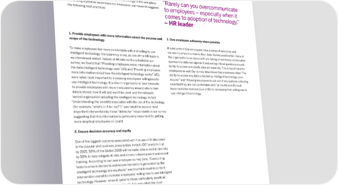 Part IV: How can organizations empower employees with intelligent technology? When it comes to introducing intelligent technology in the workplace “Rarely can you overcommunicate and driving a positive experience for employees, our research suggests to employees – especially when it the following best practices: comes to adoption of technology ⸀” –HR leader 1. Provide employees with more information about the purpose and 3. Give employees autonomy where possible scope of the technology It is important that employees have a sense of autonomy and To make employees feel more comfortable with and willing to use ownership when it comes to their data ⸀ As discussed earlier, many of intelligent technology, transparency is key, as one of the HR leaders the organizations we spoke with are taking an extremely conservative we interviewed stated ⸀ Indeed, of 44 interventions tested in our approach to data management and asking critical questions around survey, we found that “Providing employees more information about ability to access and delete data permanently ⸀ This is top of mind for the data intelligent technology uses” (#1) and “Providing employees employees as well. Our survey data shows that employees rated “The more information about how the intelligent technology works” (#2) ability to access any data collected by intelligent technology upon were rated most important to increasing employees’ willingness to request” and “Allowing employees to opt out of any systems collecting use intelligent technology ⸀ It is also in organizations’ best interests data that they are not comfortable with” as the #4 and #5 most to provide employees with more transparency around where their important interventions (out of 16) for increasing their willingness to data is stored, how it will and won’t be used, and the rationale use intelligent technology ⸀ behind organization adopting the intelligent technology ⸀ In fact, “Understanding the bene昀椀ts associated with the use of the technology (for example, “what’s in it for me?”)” was rated the second most important intervention by those “detractor” respondents in our survey, suggesting that this information is particularly important for getting more skeptical employees on board ⸀ 2. Ensure decision accuracy and equity One of the biggest concerns associated with the use of AI discussed in the popular and business press is bias. In fact, IDC1 predicts that by 2025, 50% of the Global 2000 will increase data scientist diversity by 50% to help mitigate AI bias and errors in development and model training ⸀ According to our own employee survey data, “Conducting tests to ensure decisions and recommendations generated by the intelligent technology are equitable” was the third most important intervention overall to increase employees’ willingness to use intelligent technology ⸀ However, when it came to those particularly skeptical employees (for example, “detractors”), this was rated the most important intervention, followed by other accountability mechanisms such as “Establishing an organizational fairness o昀케cer or ethics board to be responsible for implementation ⸀” 1IDC, Futurescape: Worldwide Future of Customer and Consumer 2022 Predictions, 2022, Doc #US48297321, October 2021