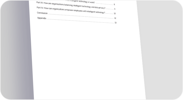 Contents Introduction ⸀ ⸀ ⸀ ⸀ ⸀ ⸀ ⸀ ⸀ ⸀ ⸀ ⸀ ⸀ ⸀ ⸀ ⸀ ⸀ ⸀ ⸀ ⸀ ⸀ ⸀ ⸀ ⸀ ⸀ ⸀ ⸀ ⸀ ⸀ ⸀ ⸀ ⸀ ⸀ ⸀ ⸀ ⸀ ⸀ ⸀ ⸀ ⸀ ⸀ ⸀ ⸀ ⸀ ⸀ ⸀ ⸀ ⸀ ⸀ ⸀ ⸀ ⸀ ⸀ ⸀ ⸀ ⸀ ⸀ ⸀ ⸀ ⸀ ⸀ ⸀ ⸀ ⸀ ⸀ ⸀ ⸀ ⸀ ⸀ ⸀ ⸀ ⸀ ⸀ 3 Part I: Is HR ready to embrace intelligent technology? ⸀ ⸀ ⸀ ⸀ ⸀ ⸀ ⸀ ⸀ ⸀ ⸀ ⸀ ⸀ ⸀ ⸀ ⸀ ⸀ ⸀ ⸀ ⸀ ⸀ ⸀ ⸀ ⸀ ⸀ ⸀ ⸀ ⸀ ⸀ ⸀ ⸀ ⸀ ⸀ ⸀ ⸀ ⸀ 4 Part II: How do employees feel about intelligent technology at work? ⸀ ⸀ ⸀ ⸀ ⸀ ⸀ ⸀ ⸀ ⸀ ⸀ ⸀ ⸀ ⸀ ⸀ ⸀ ⸀ ⸀ ⸀ ⸀ ⸀ ⸀ 6 Part III: How are organizations balancing intelligent technology and data privacy? ⸀ ⸀ ⸀ ⸀ ⸀ ⸀ ⸀ ⸀ ⸀ ⸀ 9 Part IV: How can organizations empower employees with intelligent technology? ⸀ ⸀ ⸀ ⸀ ⸀ ⸀ ⸀ ⸀ ⸀ ⸀ 10 Conclusion ⸀ ⸀ ⸀ ⸀ ⸀ ⸀ ⸀ ⸀ ⸀ ⸀ ⸀ ⸀ ⸀ ⸀ ⸀ ⸀ ⸀ ⸀ ⸀ ⸀ ⸀ ⸀ ⸀ ⸀ ⸀ ⸀ ⸀ ⸀ ⸀ ⸀ ⸀ ⸀ ⸀ ⸀ ⸀ ⸀ ⸀ ⸀ ⸀ ⸀ ⸀ ⸀ ⸀ ⸀ ⸀ ⸀ ⸀ ⸀ ⸀ ⸀ ⸀ ⸀ ⸀ ⸀ ⸀ ⸀ ⸀ ⸀ ⸀ ⸀ ⸀ ⸀ ⸀ ⸀ ⸀ ⸀ ⸀ ⸀ ⸀ ⸀ ⸀ ⸀ 12 Appendix ⸀ ⸀ ⸀ ⸀ ⸀ ⸀ ⸀ ⸀ ⸀ ⸀ ⸀ ⸀ ⸀ ⸀ ⸀ ⸀ ⸀ ⸀ ⸀ ⸀ ⸀ ⸀ ⸀ ⸀ ⸀ ⸀ ⸀ ⸀ ⸀ ⸀ ⸀ ⸀ ⸀ ⸀ ⸀ ⸀ ⸀ ⸀ ⸀ ⸀ ⸀ ⸀ ⸀ ⸀ ⸀ ⸀ ⸀ ⸀ ⸀ ⸀ ⸀ ⸀ ⸀ ⸀ ⸀ ⸀ ⸀ ⸀ ⸀ ⸀ ⸀ ⸀ ⸀ ⸀ ⸀ ⸀ ⸀ ⸀ ⸀ ⸀ ⸀ ⸀ ⸀ 13