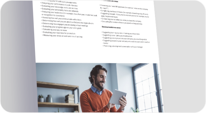 Appendix Below is the list of all intelligent technology use cases included in our global employee survey ⸀ Evaluative use cases Administrative use cases • Determining your 昀椀t with a job you applied to • Answering your basic HR questions (for example, “what are the company • Analyzing your performance in a job interview holidays?”) • Evaluating your knowledge, skills, and abilities • Completing your basic HR tasks (for example, requesting a day o昀昀 work) • Evaluating your personality traits and interests • Suggesting relevant HR documents and instructions (for example, how to • Analyzing your leadership (for example, how often you provide feedback apply for parental leave) or recognition to coworkers) • Conducting your exit interview when you leave the company • Assessing how well you communicate with others • Calculating the number of hours you spend working each day • Determining how well you are able to withstand challenges at work • Determining how engaged you are during virtual meetings Developmental use cases • Evaluating your progress against your work goals • Calculating your pay increase • Suggesting learning courses or training you should take • Evaluating your readiness for promotion • Suggesting career paths you should pursue • Measuring your stress at work and risk of quitting • Suggesting jobs or projects in your company you would be good at • Suggesting people in your company who could be your career coach or mentor • Prompting a development conversation with your manager