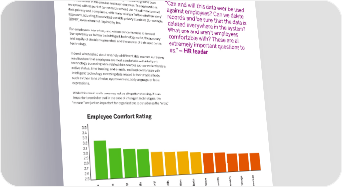 Part III: How are organizations balancing intelligent technology and data privacy? Perhaps more than any other topic, the privacy and ethical considerations related to the use of intelligent technology have been “Can and will this data ever be used front and center in the popular and business press ⸀ The organizations against employees? Can we delete we spoke with as part of our research echoed the critical importance of data privacy and compliance, with many taking a “better safe than sorry” records and be sure that the data is approach, adopting the strictest possible privacy standards (for example, deleted everywhere in the system? GDPR1) even when not required by law ⸀ What are and aren’t employees For employees, key privacy and ethical concerns relate to levels of comfortable with? These are all transparency as to how the intelligent technology works, the accuracy and equity of decisions generated, and the sources of data used by the extremely important questions to technology ⸀ us ⸀” – HR leader Indeed, when asked about a variety of di昀昀erent data sources, our survey results show that employees are most comfortable with intelligent technology accessing work-related data sources such as work calendars, active status, time tracking, and e-mails, and least comfortable with intelligent technology accessing data related to their physical body, such as their tone of voice, eye movement, body language, or facial expressions ⸀ While this result on its own may not be altogether shocking, it is an important reminder that in the case of intelligent technologies, the “means” are just as important for organizations to consider as the “ends ⸀” Employee Comfort Rating 3 ⸀5 3 ⸀4 3 ⸀3 3 ⸀2 3 ⸀1 3 ⸀0 2 ⸀9 2 ⸀8 2 ⸀7 2 ⸀6 2 ⸀5 s s y s e s e e t or x at t Calls ation Te oic sion mails ement s acking E f V e e St r o ement v anguag Calendar v xpr ctiv ernet His one e Mo A Time T ommunic T al Mo y ody L Int sic E B acial E y F Chat C Ph Figure 7: Certain data sources are more likely to violate employees’ privacy expectations ⸀ 1GDPR – The General Data Protection Regulation, a data privacy and security law in the European Union.