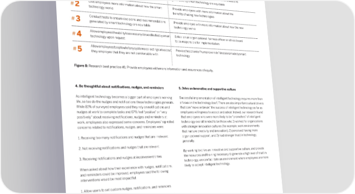 Top 5 most impactful interventions amongst: Full employee sample 121 “detractors” # 1 Give employees more information about the data smart Conduct tests to ensure decisions and recommendations technology uses generated by smart technology are equitable # 2 Give employees more information about how the smart Provide employees with more information about the technology works bene昀椀ts of using new technologies # 3 Conduct tests to ensure decisions and recommendations Provide employee with more information about how the new generated by smart technology are equitable technology works # 4 Allow employees the ability to access any data collected by smart Establish an organizational fairness o昀케cer or ethics board technology upon request to be responsible for implementation # 5 Allow employees to opt out of any systems collecting data about Provide the option to “human override” decisions made by smart they employee that they are not comfortable with technology Figure 8: Research best practice #1: Provide employees with more information and assurances of equity ⸀ 4. Be thoughtful about noti昀椀cations, nudges, and reminders 5. Drive an innovative and supportive culture As intelligent technology becomes a bigger part of employee’s working Successful implementation of intelligent technology requires more than life, so too do the nudges and noti昀椀cations these technologies generate. a focus on the technology itself. There are also important cultural drivers While 81% of surveyed employees said they rely on noti昀椀cations and that can “make or break” the success of intelligent technology as far as nudges at work to complete tasks and 67% feel “positive” or “very employees willingness to accept and adopt. Indeed, our research found positively” about receiving noti昀椀cations, nudges and reminders at that employees who were more likely to be “promoters” of intelligent work, employees also expressed some concerns. Employees’ top-rated technology overall tended to be those who 1) worked for organizations concerns related to noti昀椀cations, nudges, and reminders were: with stronger innovation cultures (for example, work environments that nurture creativity and innovation), 2) perceived having more 1. Receiving too many noti昀椀cations and nudges that are irrelevant organizational support, and 3) had stronger trust in technology, generally. 2. Not receiving noti昀椀cations and nudges that are relevant By working to drive an innovative and supportive culture, and provide 3. Receiving noti昀椀cations and nudges at inconvenient times the resources and training necessary to generate a high level of trust in technology, we can facilitate an environment where employees are more When asked about how their experience with nudges, noti昀椀cations, likely to accept intelligent technology. and reminders could be improved, employees said the following interventions would be most impactful: 1. Allow users to set custom nudges, noti昀椀cations, and reminders 2. Allow users to choose the type of noti昀椀cations, nudges, or reminders they receive 3. Allow users to choose when they do and do not receive nudges, noti昀椀cations, and reminders
