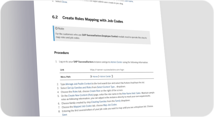 Menu Path Home Admin Center 2. Type Manage Permission Groups in the tool search box and select the feature or tool from the list. The Manage Permission Groups page opens, then select group SFCC Super Admin Group. 3. In the Choose Group Members: People Pool section, in Pick a category, choose User name. 4. In the Search Results window, select the super admin user create in pre-step. 5. Select Done. 6.2 Create Roles Mapping with Job Codes Note For the customers who use SAP SuccessFactors Employee Central module need to operate this step to map roles and job codes. Procedure 1. Log on to your SAP SuccessFactors instance and go to Admin Center using the following information: Link https://.successfactors.com/login Menu Path Home Admin Center 2. Type Manage Job Pro昀椀le Content in the tool search box and select the feature/tool from the list. 3. Select Set Up Families and Roles from Select Content Type… dropdown. 4. Choose the Roles tab, choose Create Role on the right of the screen. 5. On the Create New Content (Role) page, enter the role name in the Role Name 昀椀eld: Sales. Maintain sample roles as following information, you can adjust in the instance directly to meet your own requirements. 6. Choose family created by step Creating Families from the Family dropdown. 7. Choose the Mapped Job Codes tab, choose Map Job Codes. 8. Entering the 昀椀rst several letters of your job code you want to map until you see a dropdown list. Choose Save. Job Pro昀椀le Builder: Getting Started Post-Processing PUBLIC 17
