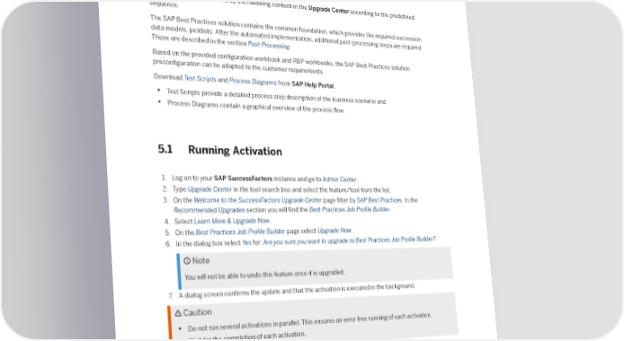 5 Implementation The solution is implemented by the following content in the Upgrade Center according to the prede昀椀ned sequence. The SAP Best Practices solution contains the common foundation, which provides the required succession data models, picklists. After the automated implementation, additional post-processing steps are required. Those are described in the section Post-Processing. Based on the provided con昀椀guration workbook and RBP workbooks, the SAP Best Practices solution precon昀椀guration can be adapted to the customer requirements. Download Test Scripts and Process Diagrams from SAP Help Portal. • Test Scripts provide a detailed process step description of the business scenario and • Process Diagrams contain a graphical overview of the process 昀氀ow. 5.1 Running Activation 1. Log on to your SAP SuccessFactors instance and go to Admin Center. 2. Type Upgrade Center in the tool search box and select the feature/tool from the list. 3. On the Welcome to the SuccessFactors Upgrade Center page 昀椀lter by SAP Best Practices. In the Recommended Upgrades section you will 昀椀nd the Best Practices Job Pro昀椀le Builder. 4. Select Learn More & Upgrade Now. 5. On the Best Practices Job Pro昀椀le Builder page select Upgrade Now. 6. In the dialog box select Yes for: Are you sure you want to upgrade to Best Practices Job Pro昀椀le Builder? Note You will not be able to undo this feature once it is upgraded. 7. A dialog screen con昀椀rms the update and that the activation is executed in the background. Caution • Do not run several activations in parallel. This ensures an error free running of each activation. • Wait for the completion of each activation. 5.2 Tracking Process The activation schedules several background jobs for executing each single con昀椀guration step. Job Pro昀椀le Builder: Getting Started Implementation 12 PUBLIC