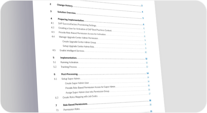 Content 1 Job Pro昀椀le Builder ...........................................................3 2 Change History.............................................................4 3 Solution Overview...........................................................5 4 Preparing Implementation.....................................................6 4.1 SAP SuccessFactors Provisioning Settings...........................................6 4.2 Creating a User for Activation of SAP Best Practices Content..............................7 4.3 Provide Role-Based Permission Access for Activation....................................8 4.4 Manage Upgrade Center Admin Permission..........................................9 Create Upgrade Center Admin Group............................................9 Setup Upgrade Center Admin Role..............................................9 4.5 Enable Intelligent Services......................................................10 5 Implementation............................................................12 5.1 Running Activation...........................................................12 5.2 Tracking Process.............................................................12 6 Post-Processing............................................................14 6.1 Setup Super Admin...........................................................14 Create Super Admin User....................................................14 Provide Role-Based Permission Access for Super Admin..............................16 Assign Super Admin User into Permission Group....................................16 6.2 Create Roles Mapping with Job Codes..............................................17 7 Role Based Permissions......................................................18 7.1 Permission Roles.............................................................18 8 More Information...........................................................21 9 Ticket Component..........................................................22 Job Pro昀椀le Builder: Getting Started Content 2 PUBLIC