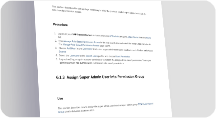 6.1.2 Provide Role-Based Permission Access for Super Admin Use This section describes the set-up steps necessary to allow the previous created super admin to manage the role-based permission access. Procedure 1. Log on to your SAP SuccessFactors instance with user UPCAdmin and go to Admin Center from the Home tab. 2. Type Manage Role-Based Permission Access in the tool search box and select the feature/tool from the list. The Manage Role-Based Permission Access page opens. 3. Choose Add User. In the Username 昀椀eld, enter super admin user name you have created before and choose Search. 4. Select the Username in the Search Users portlet and choose Grant Permission. 5. Log out and log on again as super admin user to refresh the assigned role-based permission. Your super admin user now has authorization to maintain role-based permissions. 6.1.3 Assign Super Admin User into Permission Group Use This section describes how to assign the super admin user into the super admin group SFCC Super Admin Group which delivered in automation. Procedure 1. Log on to your SAP SuccessFactors instance and go to Admin Center using the following information: Link https://.successfactors.com/login Job Pro昀椀le Builder: Getting Started Post-Processing 16 PUBLIC