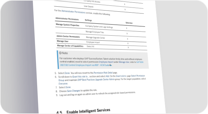User Permissions Settings Selection General User Permission User Login X Live Pro昀椀le Access X Company Info Access X User Search X For the Administrator Permissions section, enable the following: Administrator Permissions Settings Selection Manage System Properties Company System and Logo Settings X Manage Employee Files X Admin Center Permissions Manage Upgrade Center X Manage User Employee Import X Manage Center of Capabilities Select All X Note For customer who deploys SAP SuccessFactors Talent solution 昀椀rstly time and without employee central enabled, need to select permission Employee Import under Manage User, refer to SAP KBA 2187218 Control Employee Import via RBP - HCM Suite . 5. Select Done. You will now revert to the Permission Role Detail page. 6. Scroll down to Grant this role to... section and select Add. On the Grant role to: page Select Permission Group and maintain SAP Best Practices Upgrade Center Admin group. For the target population, select Everyone. 7. Select Done. 8. Choose Save Changes to update the role. 9. Log out and log on again as admin user to refresh the assigned role-based permissions. 4.5 Enable Intelligent Services Intelligent Services is enabled by default in new customer instances. Customers with instances older than Q1/2017 need to use upgrade Center to enable Intelligent Services following Enabling Intelligent Services and Retrieving SuccessStore Rules with Upgrade Center | SAP Help Portal. After the upgrade, perform the following steps: 1. Log on to your SAP SuccessFactors instance and go to Admin Center from the Home tab. Job Pro昀椀le Builder: Getting Started Preparing Implementation 10 PUBLIC