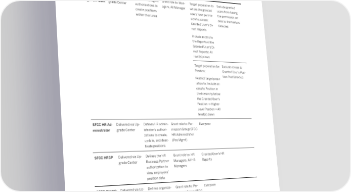 Exclude Granted User from having Building Block Permission Groups the permission ac- Role Con昀椀g. Guide Permission or Users Target Population cess to him/herself SFCC Man- Delivered via Up- De昀椀nes managers’ Grant role to: Man- Target population to Exclude granted ager on Team grade Center authorizations to agers, All Manager whom the granted users from having create positions users have permis- the permission ac- within their area sion to access: cess to themselves: Granted User's Di- Selected rect Reports Include access to the Reports of the Granted User's Di- rect Reports: All level(s) down Target population for Exclude access to Position: Granted User's Posi- tion: Not Selected Restrict target popu- lation to: Include ac- cess to Position in the hierarchy below the Granted User's Position -> Higher- Level Position = All level(s) down SFCC HR Ad- Delivered via Up- De昀椀nes HR admin- Grant role to: Per- Everyone ministrator grade Center istrator’s authori- mission Group SFCC zations to create, HR Administrator update, and deac- (Pos Mgmt) tivate positions SFCC HRBP Delivered via Up- De昀椀nes the HR Grant role to: HR Granted User's HR grade Center Business Partner Managers, All HR Reports authorization to Managers view employees’ position data SFCC Organi- Delivered via Up- De昀椀nes organiza- Grant role to: Per- Everyone zation Design grade Center tion design ex- mission Group SFCC Expert perts’ authoriza- Organization Design tions to create Expert positions and per- form bulk changes to these Job Pro昀椀le Builder: Getting Started Role Based Permissions PUBLIC 19