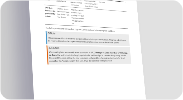 Exclude Granted User from having Building Block Permission Groups the permission ac- Role Con昀椀g. Guide Permission or Users Target Population cess to him/herself SFCC Super Delivered via Up- All Position Man- Grant role to: Per- Everyone Admin grade Center agement related mission Group SFCC permissions Super Admin Group SAP Best- Creation descri- All system permis- Practices Up- bed in Con昀椀gura- sions for imple- grade Center tion Guide – Get- menting SAP Best Admin ting Started Practices content via Upgrade Cen- ter The Delta permissions delivered via Upgrade Center are listed in the appropriate workbook. Note This assignment is only a dummy assignment to create the permission groups. The group criteria’s must be reworked based on the requirement after the employees/users are available in the system. Caution When adding later on manually a new permission to SFCC Manager on Direct Reports or SFCC Manager on Team, the restriction in the target population for position might be canceled during saving. In order to prevent this, while adding the new permission, un昀氀ag and then 昀氀ag again a checkbox in the Target population for Position and only then save. Thus, the restriction will be preserved. Job Pro昀椀le Builder: Getting Started Role Based Permissions 20 PUBLIC