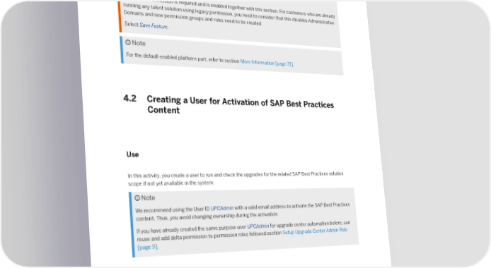 Switch Status Writing Assistant Enabled Caution Role-based Permission is required and is enabled together with this section. For customers who are already running any talent solution using legacy permission, you need to consider that this disables Administrative Domains and new permission groups and roles need to be created. Select Save Feature. Note For the default enabled platform part, refer to section More Information [page 21]. 4.2 Creating a User for Activation of SAP Best Practices Content Use In this activity, you create a user to run and check the upgrades for the related SAP Best Practices solution scope if not yet available in the system. Note We recommend using the User ID UPCAdmin with a valid email address to activate the SAP Best Practices content. Thus, you avoid changing ownership during the activation. If you have already created the same purpose user UPCAdmin for upgrade center automation before, can reuse and add delta permission to permission roles followed section Setup Upgrade Center Admin Role [page 9]. Procedure 1. Log on to SAP SuccessFactors Provisioning for your instance using the following link: Link https://.successfactors.com/provisioning_login Job Pro昀椀le Builder: Getting Started Preparing Implementation PUBLIC 7