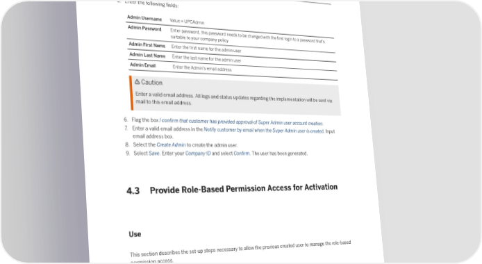 2. Choose the company by selecting the company name. 3. Access the activity using one of the following navigation options: Menu Path Edit Company Settings Company Settings 4. Search for Admin Username. 5. Enter the following 昀椀elds: Admin Username Value = UPCAdmin Admin Password Enter password, this password needs to be changed with the 昀椀rst login to a password that’s suitable to your company policy Admin First Name Enter the 昀椀rst name for the admin user Admin Last Name Enter the last name for the admin user Admin Email Enter the Admin’s email address Caution Enter a valid email address. All logs and status updates regarding the implementation will be sent via mail to this email address. 6. Flag the box I con昀椀rm that customer has provided approval of Super Admin user account creation. 7. Enter a valid email address in the Notify customer by email when the Super Admin user is created. Input email address box. 8. Select the Create Admin to create the admin user. 9. Select Save. Enter your Company ID and select Con昀椀rm. The user has been generated. 4.3 Provide Role-Based Permission Access for Activation Use This section describes the set-up steps necessary to allow the previous created user to manage the role-based permission access. Procedure 1. Log on to your SAP SuccessFactors instance and go to Admin Center from the Home tab. 2. Type Manage Role-Based Permission Access in the tool search box and select the feature/tool from the list. The Manage Role-Based Permission Access page opens. Job Pro昀椀le Builder: Getting Started Preparing Implementation 8 PUBLIC