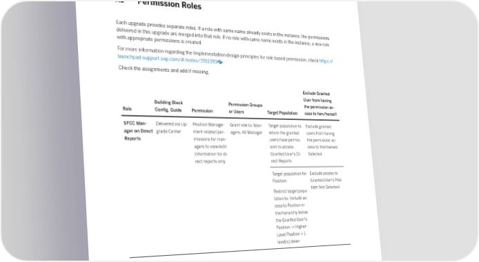 7 Role Based Permissions 7.1 Permission Roles Each upgrade provides separate roles. If a role with same name already exists in the instance, the permissions delivered in this upgrade are merged into that role. If no role with same name exists in the instance, a new role with appropriate permissions is created. For more information regarding the Implementation design principles for role based permission, check https:// launchpad.support.sap.com/#/notes/2911393 . Check the assignments and add if missing. Exclude Granted User from having Building Block Permission Groups the permission ac- Role Con昀椀g. Guide Permission or Users Target Population cess to him/herself SFCC Man- Delivered via Up- Position Manage- Grant role to: Man- Target population to Exclude granted ager on Direct grade Center ment related per- agers, All Manager whom the granted users from having Reports missions for man- users have permis- the permission ac- agers to view/edit sion to access: cess to themselves: information for di- Granted User's Di- Selected rect reports only rect Reports Target population for Exclude access to Position: Granted User's Posi- tion: Not Selected Restrict target popu- lation to: Include ac- cess to Position in the hierarchy below the Granted User's Position -> Higher- Level Position = 1 level(s) down Job Pro昀椀le Builder: Getting Started Role Based Permissions 18 PUBLIC